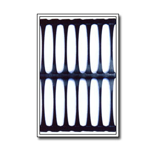 單向拉伸的土工格柵是由高分子聚合物經(jīng)擠出壓成薄板再沖規(guī)則孔網(wǎng),然后縱向拉伸而成。這種過程中使高分子成定向線性狀態(tài)并形成分布均勻、節(jié)點強度高的長橢圓形網(wǎng)狀整體性結(jié)構(gòu)。此種結(jié)構(gòu)具有相當(dāng)高的拉伸強度和拉伸模量,特別是我公司此類產(chǎn)品更具有高水平的高早期(伸長率在2%—5%)拉伸強度和拉伸模量。給土壤提供了理想的力的承擔(dān)和擴(kuò)散的連鎖系統(tǒng)。該產(chǎn)品拉伸強度大(>150Mpa),適應(yīng)各種土壤,是目前廣為采用的加筋加固材料。